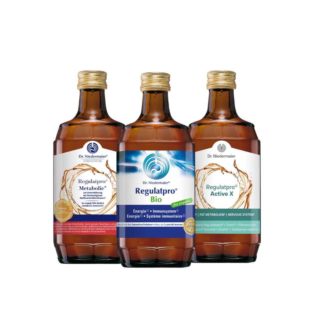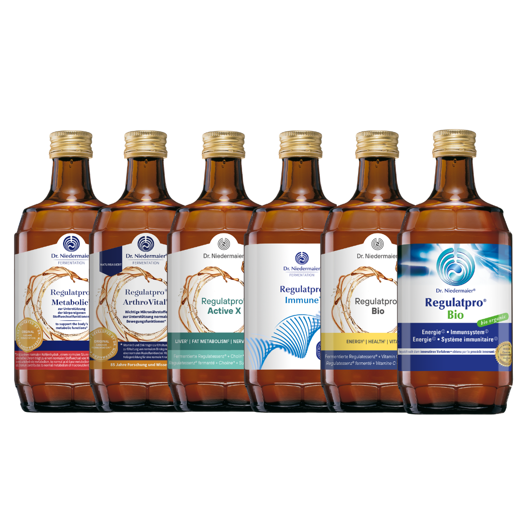 Individuell konfigurierbar aus: Rechtsregulat® Bio bzw. Regulatpro® Bio, Regulatpro® Bio mit Ananas-Geschmack, Regulatpro® ArthroVital, Regulatpro® Metabolic, Regulatpro® Immune und Regulatpro® Active X
