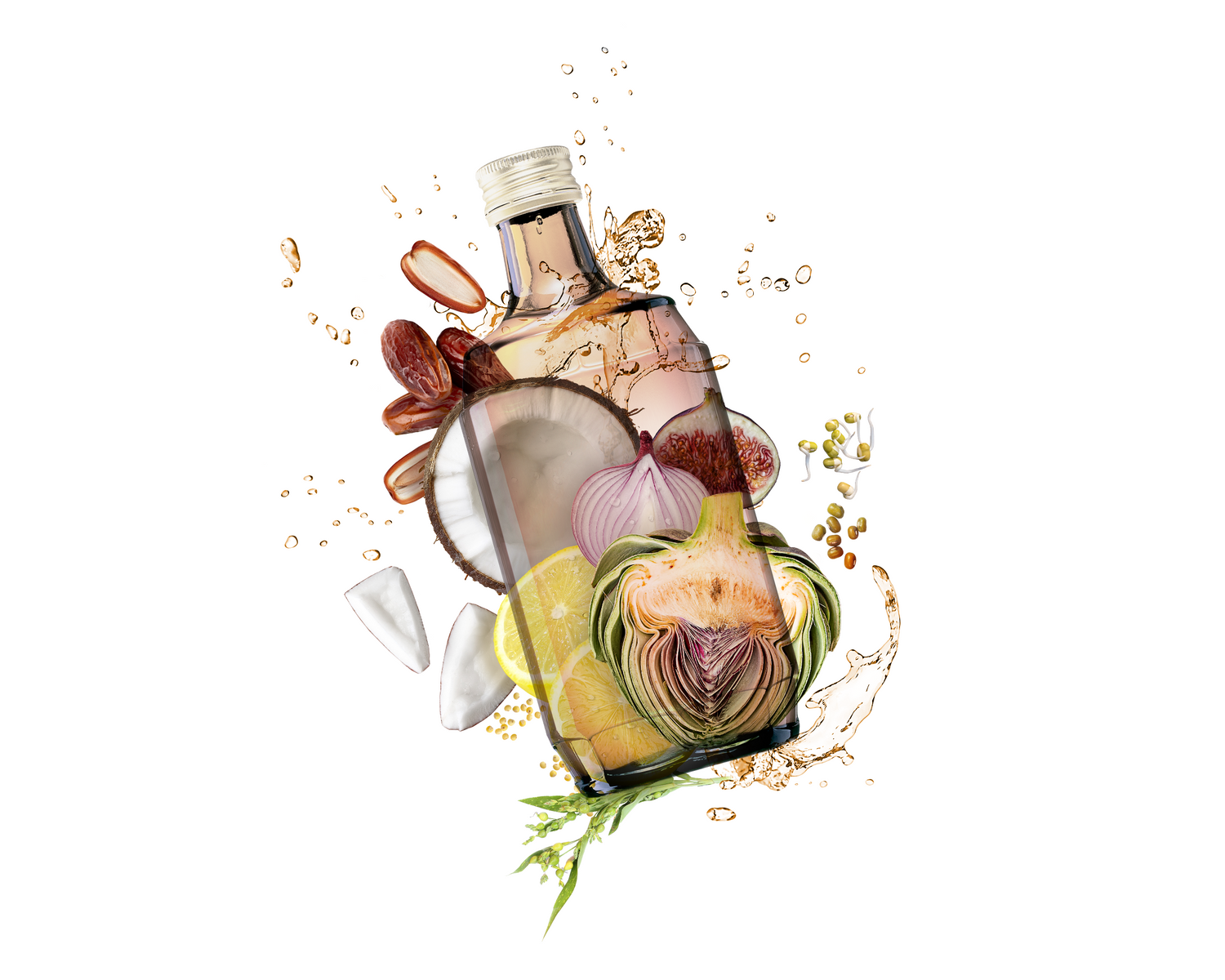 Kaskadenfermentiertes Konzentrat 50% (Wasser, Zitronen, Feigen, Datteln, Walnüsse, Sojabohnen, Zwiebeln, Kokosnüsse, Sellerie, Mungosprossen, Artischocken, Erbsen, Hirse), Wasser, Pflaumensaftkonzentrat, Kollagen 12,5%, Birnensaftkonzentrat, L-Ascorbinsäure, Glucosamin Hydrochlorid (aus Krebstieren) 1,5%, Dimethylsulfon 0,75%, Glucuronolacton 0,5%, Hyaluronsäure 0,15%, Zinkchlorid, Cholecalciferol, Kupfersulfat, Natriumselenat.
